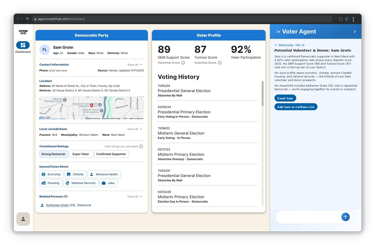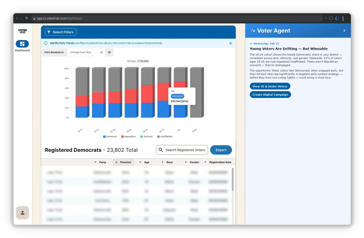 VoterHub gives Democratic campaigns and progressive organizations the constituent intelligence, party trend data, and AI-powered insights to make smarter strategic decisions.